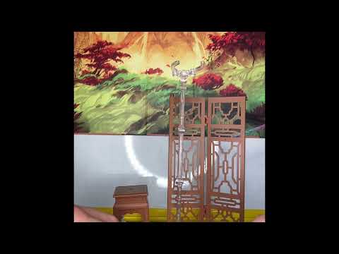Image: Miniature diorama scene with a strong blue and purple lighting effect. In the center, there is a small, ornate brown table and a matching wooden screen featuring geometric cut-out designs. The floor is black with gold patterns, including a large circular emblem decorated with swirling waves and cloud motifs. To the right, there is part of a large turquoise parasol and a red curved element, which could be part of another prop or furniture.